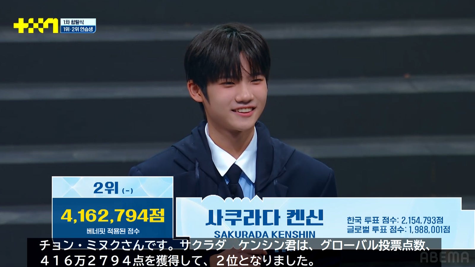 今回で98人から70人に絞られ、投票点数はこの第1次合格脱落式後リセットされることが発表。次ラウンドでは14人×5チームに分けてのバトルとなることも明かされた。デビュー圏内のトップ7には、チョン・ミヌク、サクラダ ケンシン、キム・ソンミン、キム・シフン、マージンシャン、チャン・ヨジュン、ソ・キョンベがランクイン。タイトルソングでセンターを務めたことが話題を呼んだ日本出身のサクラダ ケンシンは2位。チョン・ミヌクは2週連続で1位をキープしていたが、今回もその座を守る結果となった。(modelpress編集部)
