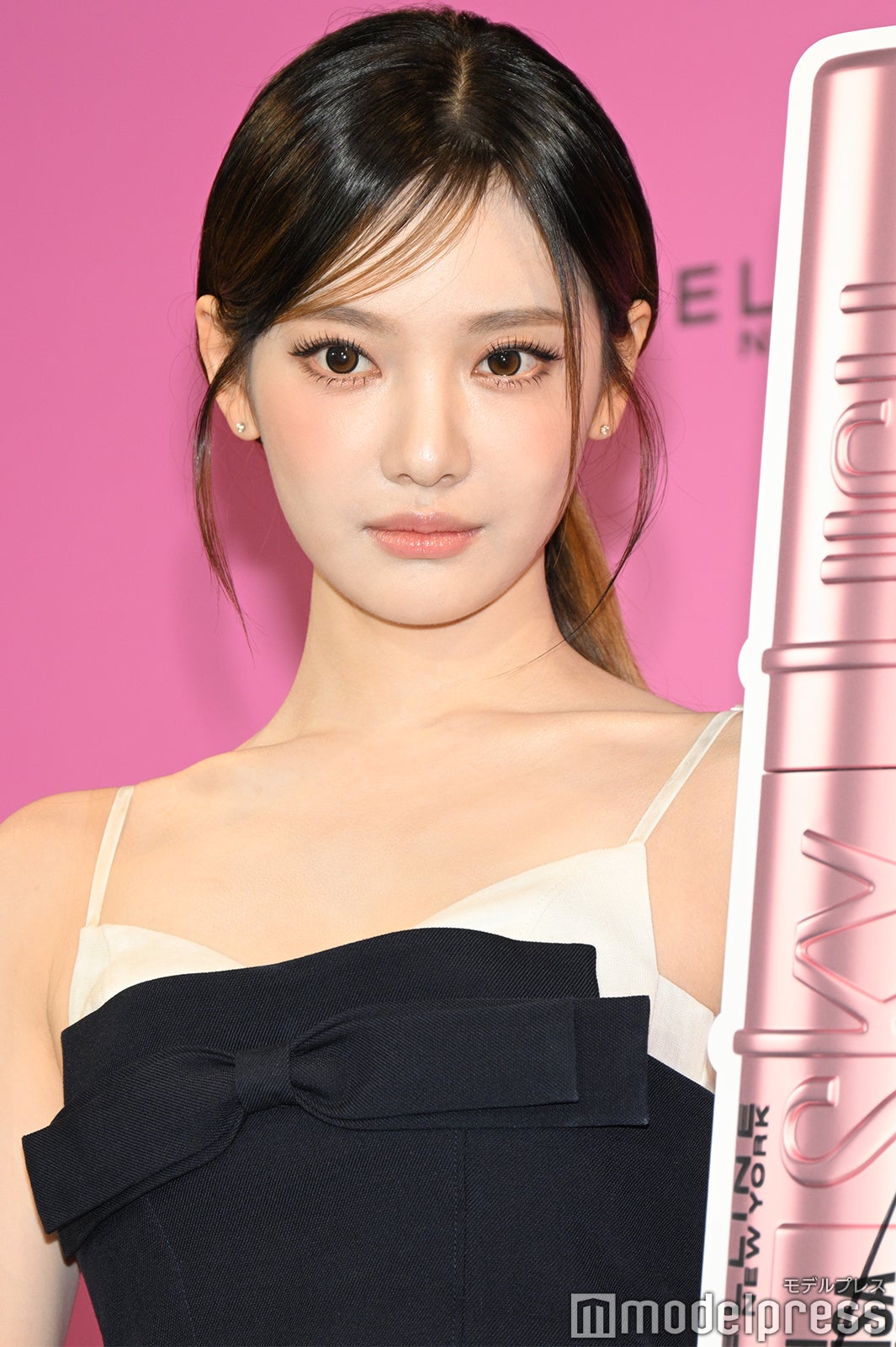 メイベリン ニューヨークの北アジア・東南アジア ブランドアンバサダーを務めるニンニン。ツートンカラーのミニ丈ワンピースを着こなし、美しいスタイルを披露した。ファッションポイントを問われると「シックなルックでコーディネートをしました」とにっこり。アイメイクについては、「スカイハイのアイドルブラックを使っています」と語っていた。