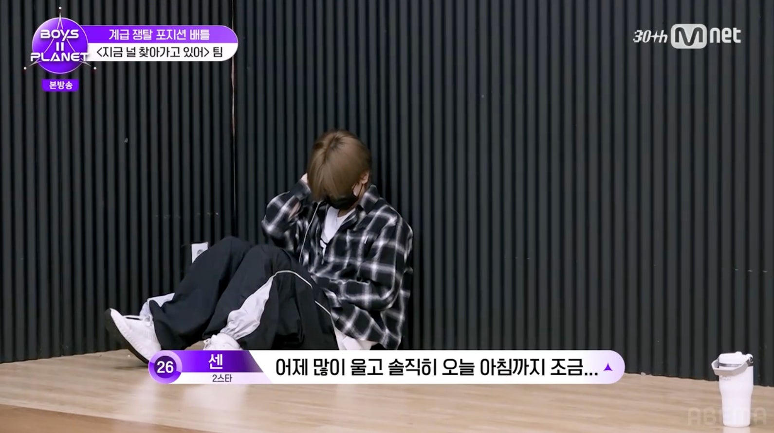 マスター陣の前での中間チェックの日、緊張気味のセンは音程を外してしまい、それをきっかけに他のメンバーたちのミスも続いてしまう。マスターからも「自信がなさそう」「弱い感じ」などのコメントが相次ぎ、そして他チームの練習生から評価を受ける日にも歌のリズムが少し速くなってしまったセンには、「みんなで歌う曲なのに、1人だけ浮いていた」など辛辣な評価コメントが。チームへの申し訳なさからセンは涙を流してしまい、さらには床に倒れ込んで「このチームで本当に素敵なパフォーマンスをしたいのに」と号泣してしまった。