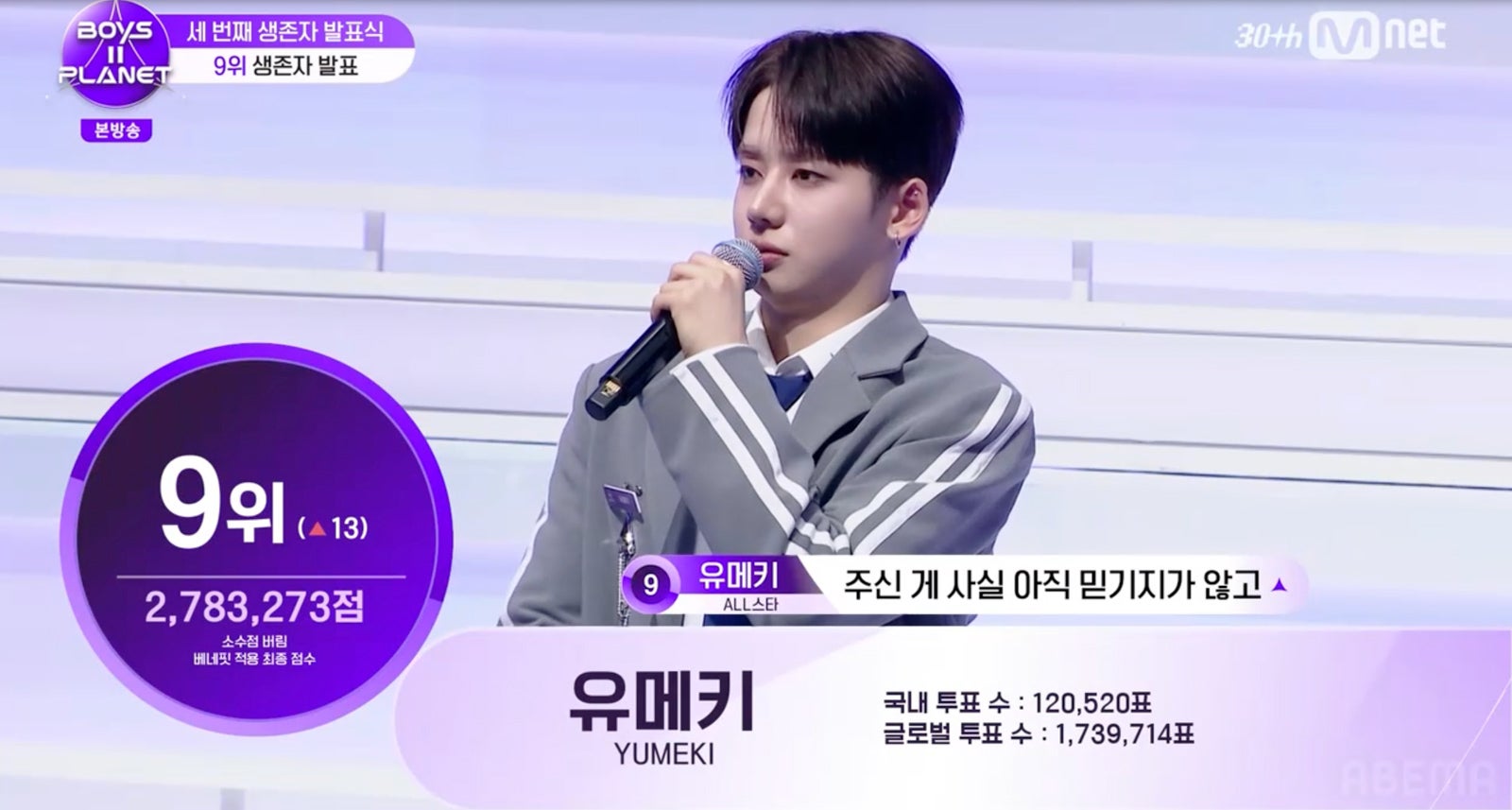 第5話の「第1回生存者発表式」が行われ練習生は48人となり、第8話の「第2回生存者発表式」にてセミファイナルに進出する24人の練習生が発表に。そして第10話では「第3回生存者発表式」が行われ、セミファイナリスト24人の練習生中、16人の練習生がファイナルに進出。数々のK-POPアーティストの振付を手がけてきた人気振付師でダンサーの日本人練習生・ユメキは「第2回生存者発表式」では22位でギリギリのラインだったため、「第3回生存者発表式」で16位以内に入ることができるのか、注目が集まっていた。15位からどんどんと名前が呼ばれていき、TOP8の8位の候補としてチョン・サンヒョンと共に名前を呼ばれる。ユメキを慕っている16歳の練習生・スィ・チンウィも「メキ〜!」と笑顔で喜び。他の練習生たちも「ユメキさんかなりランクアップしてるよね?!」と驚く。そして8位として名前を呼ばれたのはサンヒョン。ユメキは惜しくもTOP8を逃したものの第9位に。「今こんなに高い順位を与えてくださったのが、まだ実感が湧きません。どんな姿を見せても、常に信頼してついてきてくださるスタークリエイターの皆さんに本当に感謝します」と語った。