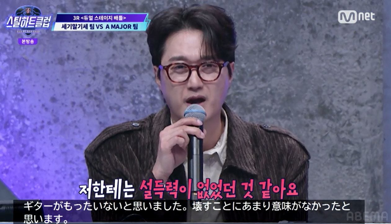 さらにソヌ・ジョンアも「アイデアもエネルギーも良かったですが、伝える力が足りなかったと思います」と厳しい評価。審査員たちは口々に「ギターを壊すためにきたの?僕はちょっと悲しかったよ」「ちょっと見苦しかった」「ジホはもう少し考えた方がいいと思う」と言い合っていた。(『STEAL HEART CLUB』/ABEMA K WORLDチャンネル)