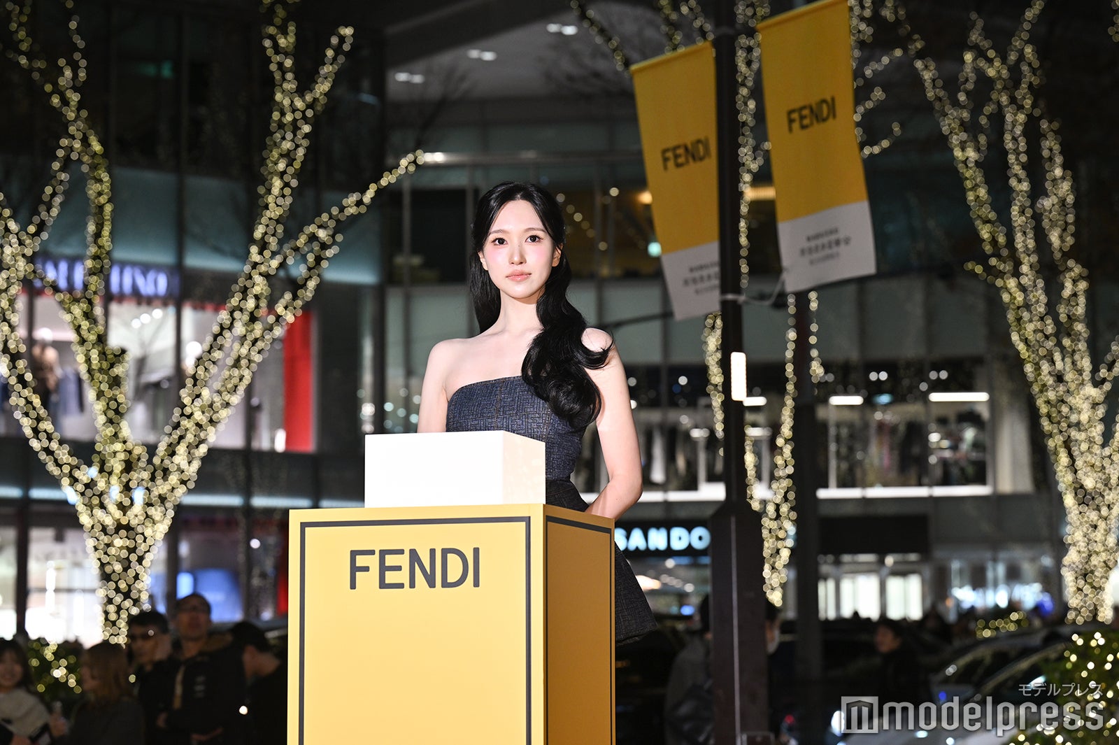 バルーンスカートが特徴的なショート丈のビスチェドレスを身にまとったミナ。登場するやいなや、表参道を行き交う人から悲鳴や歓声が鳴り止まず、街中が騒然とする中でトークセッションが行われた。ファッションのポイントを聞かれたミナは「今日はデニムにキルティングでFFロゴモチーフが施されているドレスを着てきたんですが、頭と靴の大きなリボンをポイントにしてラブリーに仕上げてきました」と紹介。お気に入りのアイテムについては「フェンディ家のワンちゃんをモチーフにしたチャームがとってもかわいくて、他にもオシャレなお洋服をきたワンちゃんたちがたくさんいるので、ぜひ皆さんも注目してもらえたらなと思います」とおすすめした。