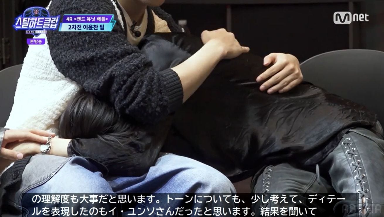発表の前から緊張で震えていたケイテンは、糸が切れたように仲間の膝に倒れ込み、泣き出してしまう。「心が痛む」「泣かないで」と励ますメンバー。ケイテンは「本当に心が落ちました。人生までと言ったらおかしいですが、この番組の影響がすごいので…。ここでデビューしたいです」と切実な思いを明かし、ユンソは「僕も胸が痛む」とため息をついて、ケイテンを抱きしめて励ました。(『STEAL HEART CLUB』/ABEMA K WORLDチャンネル)