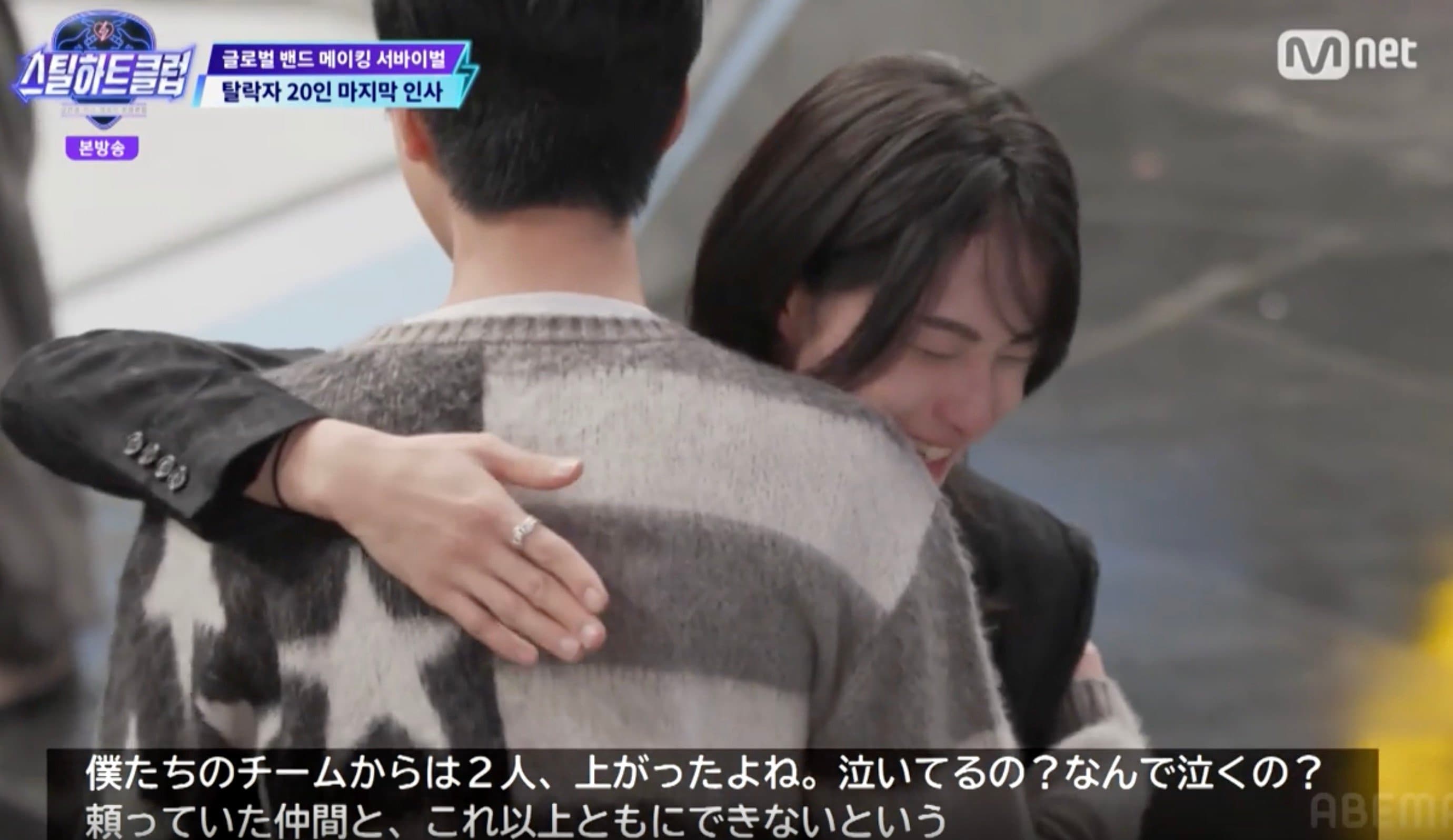 MCを務めるムン・ガヨンは「人生で大事なのは、スピードではなく方向です。脱落は失敗ではなく、長く自分がやりたいことを、最後までやり遂げてほしいとお伝えしたいです。皆さん、お疲れ様でした」と脱落者にエール。最後の瞬間、参加者たちは抱き合って号泣し「なんで君も泣いてるの?」「この人たちが落ちるなんて」「僕の分まで頑張ってほしい」「本当に寂しい」「みんなと家族になった気がして、家族と別れる感じがとても悲しかったです」と別れを悲しんだ。(『STEAL HEART CLUB』/ABEMA K WORLDチャンネル)