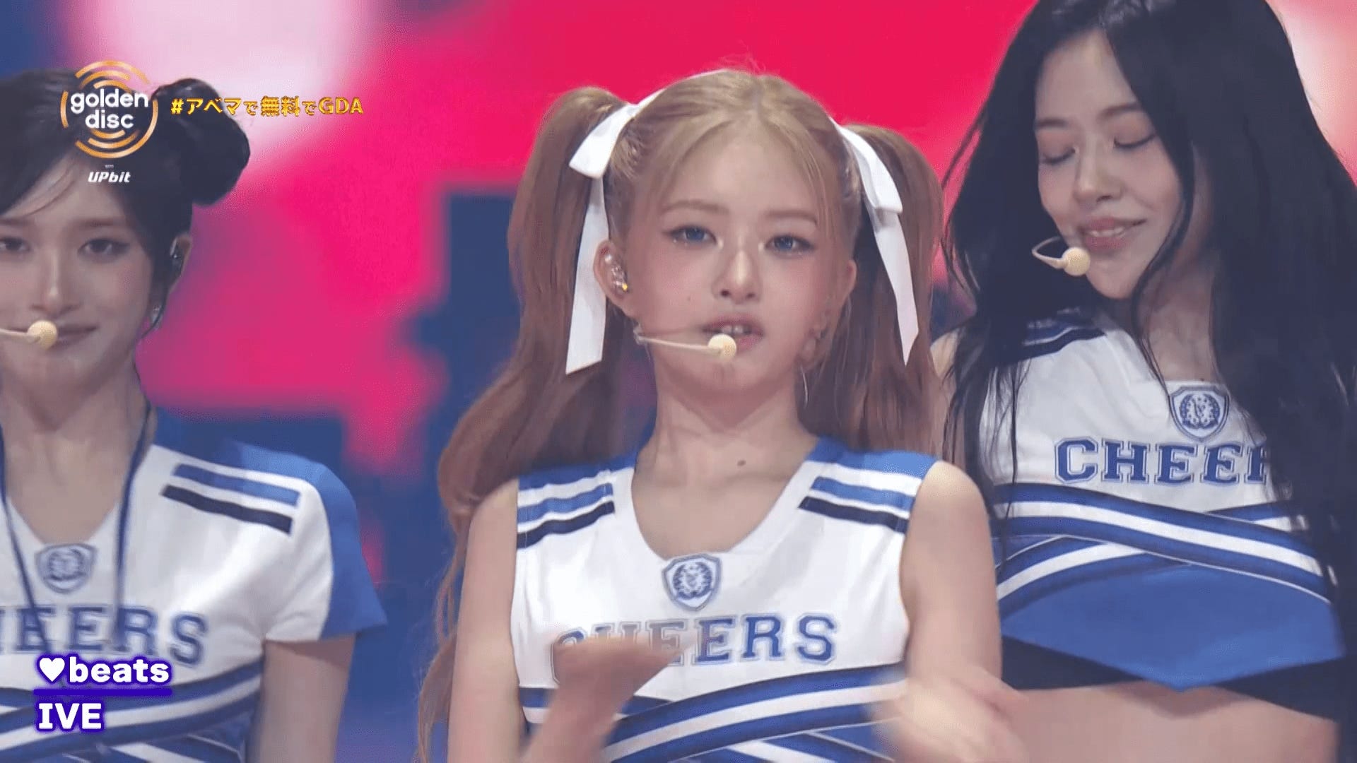 ブルーと白のチアガール風衣装に身を包み、ステージに登場したIVE。「(絵文字でハートマーク)beats」ではダンサーとともにポンポンを持ち、チアダンスを彷彿とさせる振り付けを披露。ピンクのロングヘアのガウルやツインテールに白のリボンをつけたレイと、パフォーマンスだけでなく、圧倒的なビジュアルでも会場を夢中にさせていく。先日高校を卒業したばかりのイソは、ツインのおだんごヘアでキュートさを存分にアピールした。