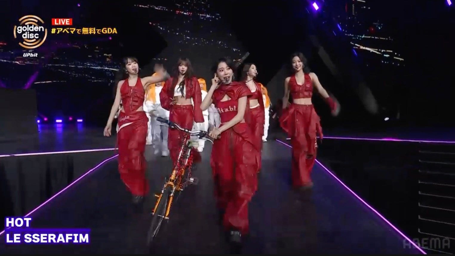 「腹筋きれい!」「ビジュ最強」LE SSERAFIM、大胆衣装でスゴすぎるパフォーマンス!サクラは自転車でステージを駆け巡る