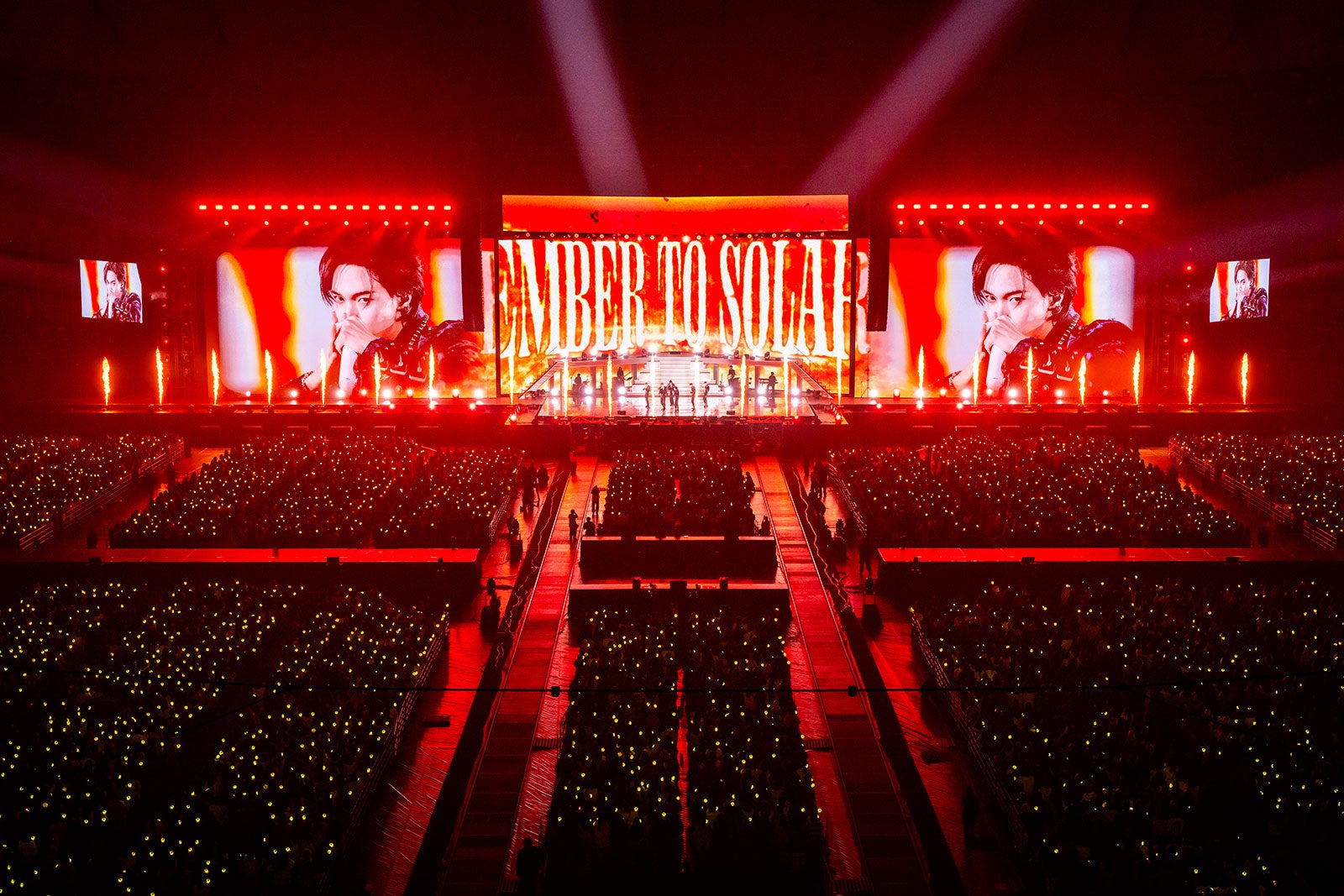 3曲目は「Ember to Solar」。タイトルがビジョンに映し出された途端、大きな歓声が上がり、イントロからメンバー全員の名前を呼ぶBRIIZEのコールがバッチリ決まる。ワールドツアーの一環で、日本ではアリーナツアーとして行われた“[RIIZING LOUD]ツアー”の際は1曲目に据えられ、ライブの導火線として使われていたが、今回はオープニングブロックのピークを創出。ダンスブレイクを入れるアレンジも施され、迫力のパフォーマンスを見せつけた。