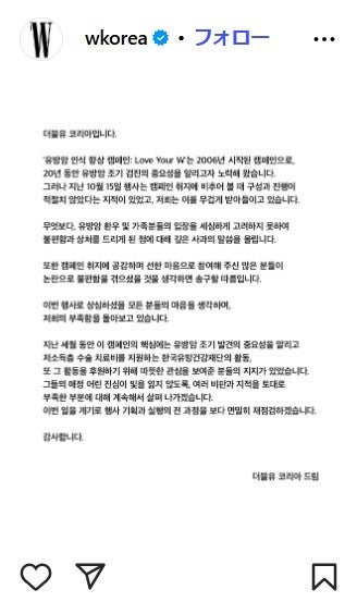 韓国ファッション誌「W Korea」乳がん啓発イベントの不適切内容を謝罪「全過程をより綿密に再検討いたします」【全文】
