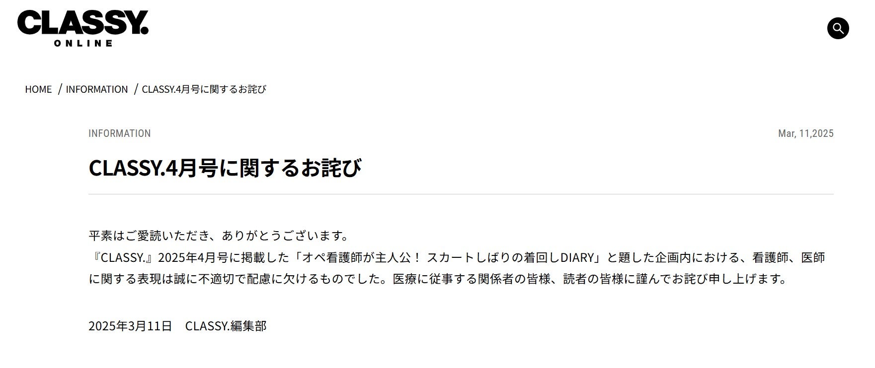 2. ファッション誌「CLASSY.」が謝罪 着回し企画で「ドロドロ病院内不倫」の表現