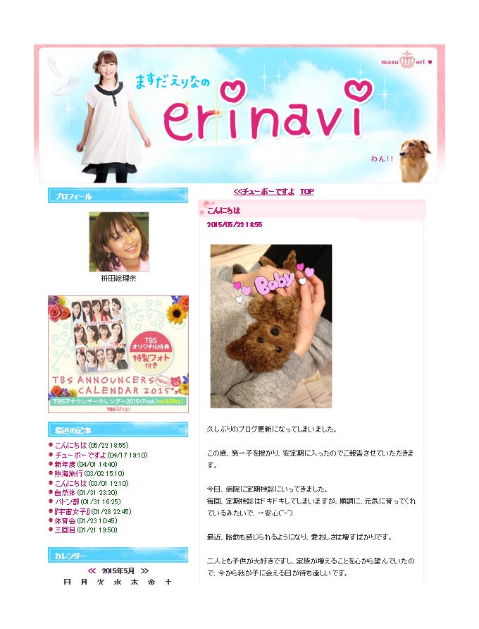 同日付のブログにて、第1子妊娠を発表。すでに安定期に入ったことを報告するとともに、「順調に、元気に育ってくれているみたいで、一安心 最近、胎動も感じられるようになり、愛おしさは増すばかりです」と現在の心境をつづった。
