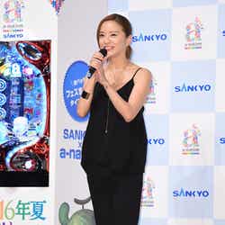アーティストのhitomiが1日、都内にて開催されたパチンコ新機種のプレス発表会に倖田來未、鈴木亜美と出席。5月に第3子の妊娠を発表して以降初めて公の場に登場したhitomiは、ゆったりとしたワンピースで美脚を覗かせて登壇した。