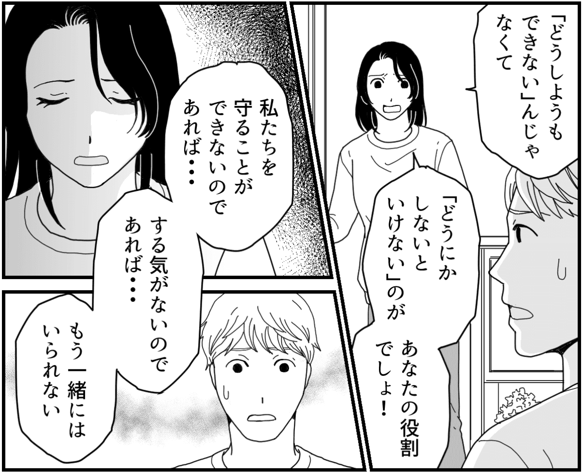 夫があきらめてしまったら、私たちはもう終わりなのです。どうにもならないんじゃなくて、どうにかしないといけないのです。私や子どもたちを守ることができないのであれば……見えてくる結論はただ一つ。一緒にいるのはもう無理です。