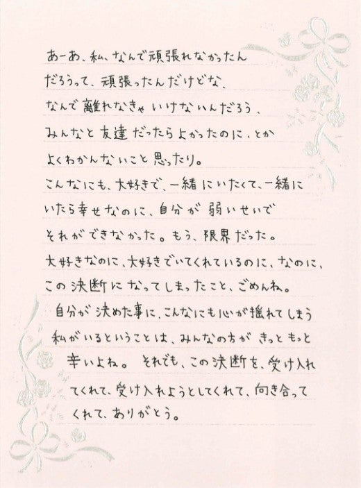 卒業セレモニーでは従来の手紙を読む形式ではなく、直接観客に語りかける形式をとった。また、本番で足を故障したが、それに耐えてのパフォーマンスとなった。