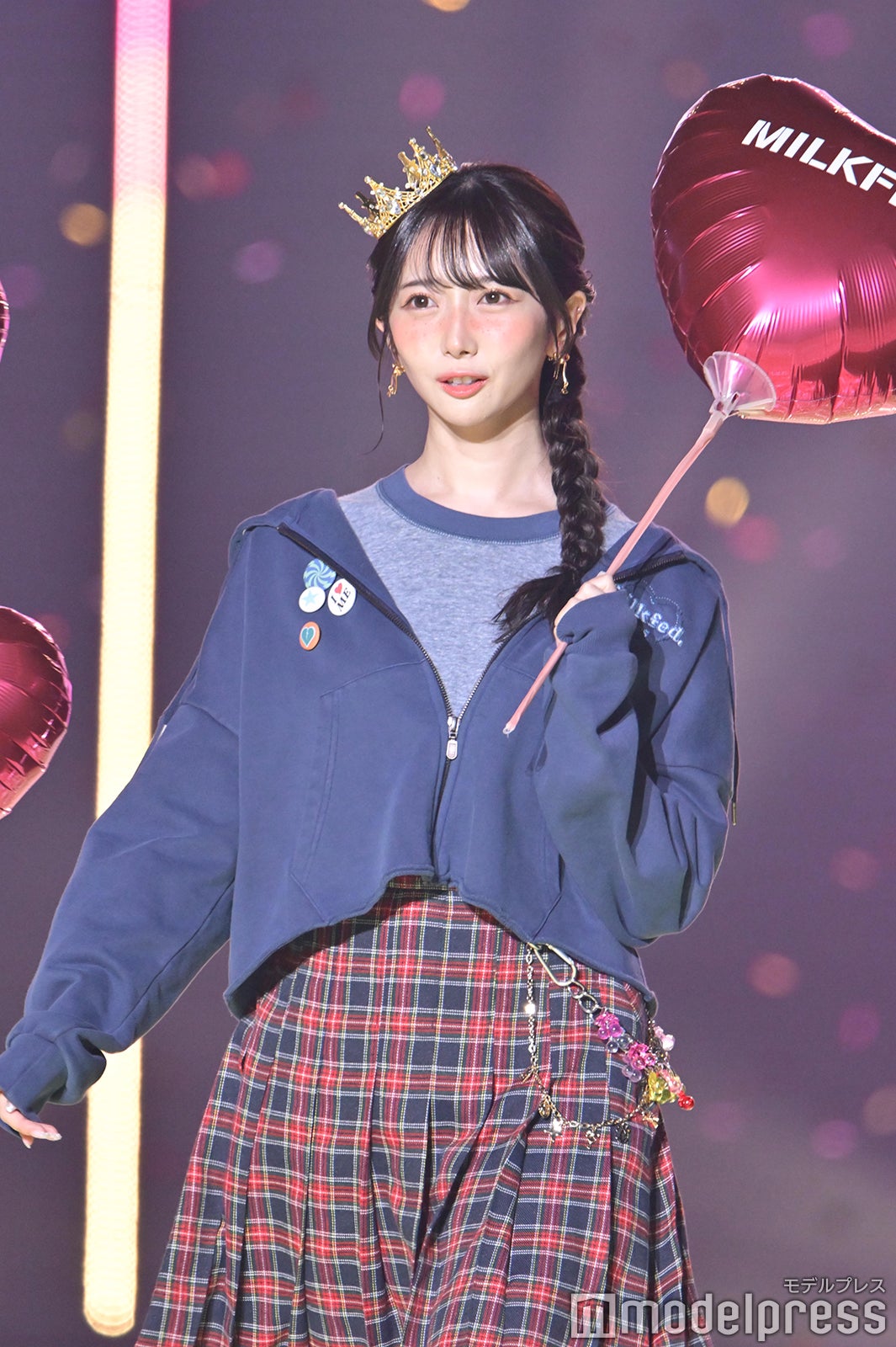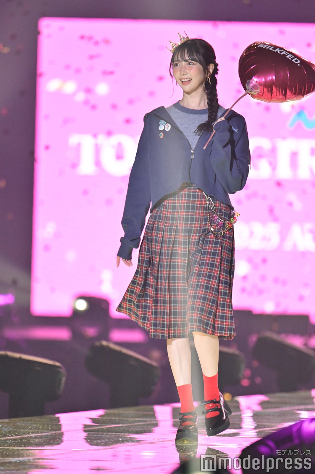 ≠ME谷崎早耶、“あざと可愛い”ウインクで魅了 パーカー×チェックスカートのカジュアルコーデ【TGC2025A/W】