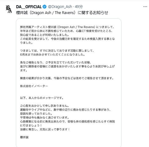 Dragon Ash櫻井誠、狭心症のため活動休止「元気に戻ってまいります」ファンに呼びかけも