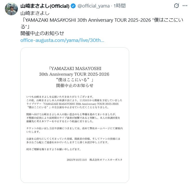 山崎まさよし、ライブツアー全公演中止を発表「不整脈の症状により長時間のライブ演奏が困難」【全文】