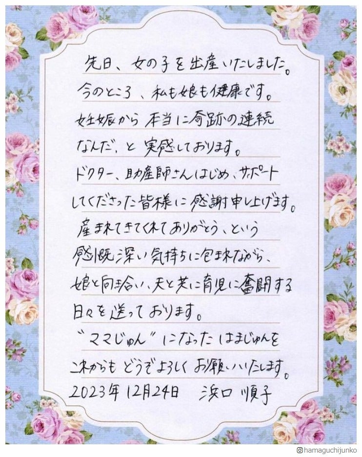 38歳・浜口順子、第1子女児出産を報告 直筆で思いつづる「妊娠から本当に奇跡の連続なんだ、と実感しております」<コメント全文>