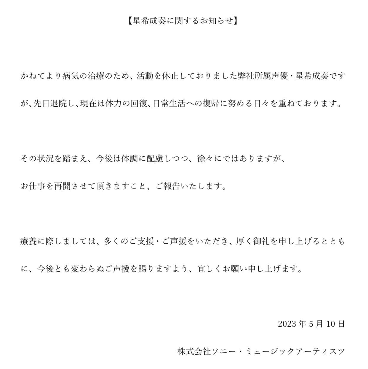 “急性リンパ性白血病”で活動休止の声優・星希成奏、仕事再開を報告