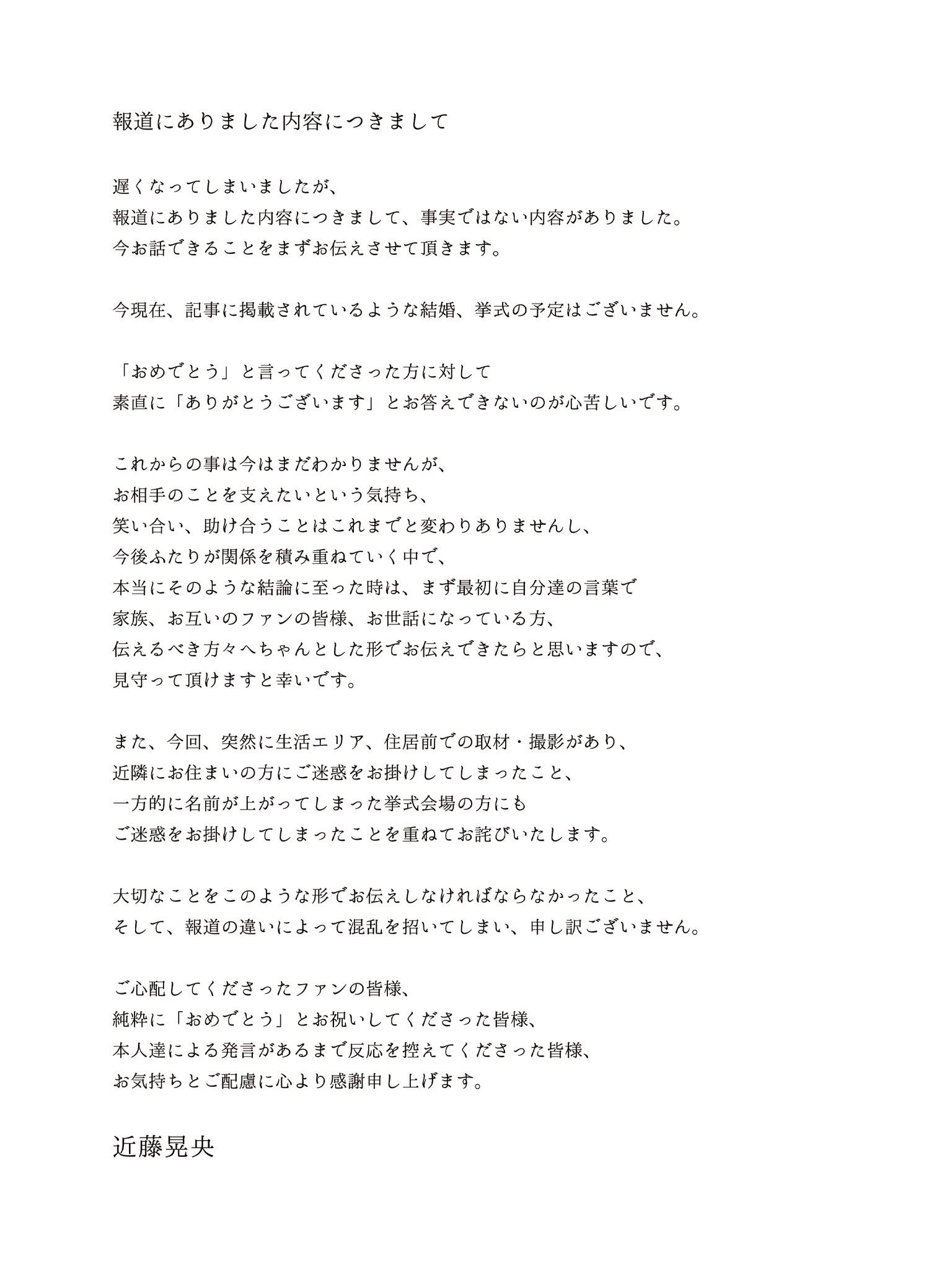 松井玲奈と交際の近藤晃央、コメント発表 今後について言及<全文>