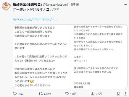 「SPY×FAMILY」アーニャ声優・種崎敦美、一部活動制限「出会った作品やキャラクターを変わらず大切にしていくために」