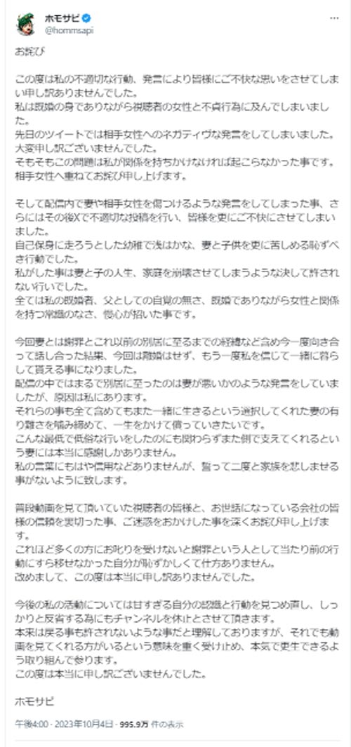 YouTuberホモサピ、19歳女性ファンとの不倫を謝罪「決して許されない行いでした」活動休止も発表
