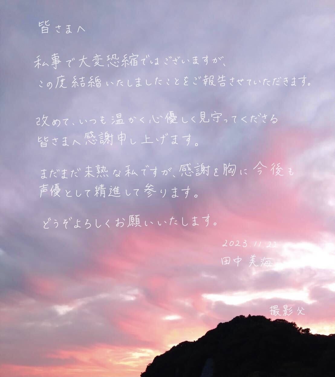 声優・田中美海、結婚を発表 直筆美文字で報告