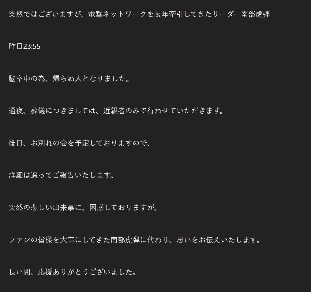 電撃ネットワーク南部虎弾さん、脳卒中で死去 72歳 公式SNSで発表「突然の悲しい出来事に困惑しております」