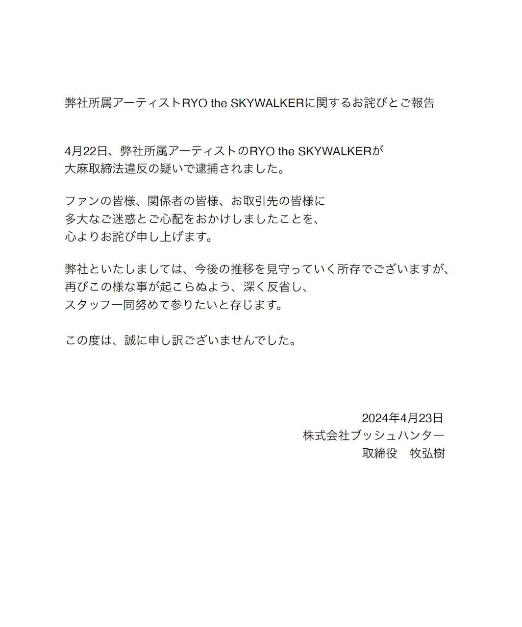 大麻所持容疑で逮捕・RYO the SKYWALKER、所属事務所が謝罪<コメント全文>