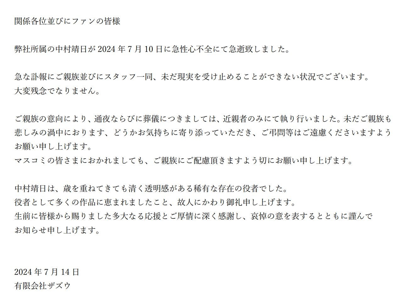 俳優・中村靖日さん、51歳で急死 急性心不全のため【事務所コメント全文】