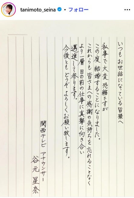 カンテレ谷元星奈アナ、“身長40cm差”一般男性との結婚発表 大学時代に出会ったお相手は東京から大阪に移住