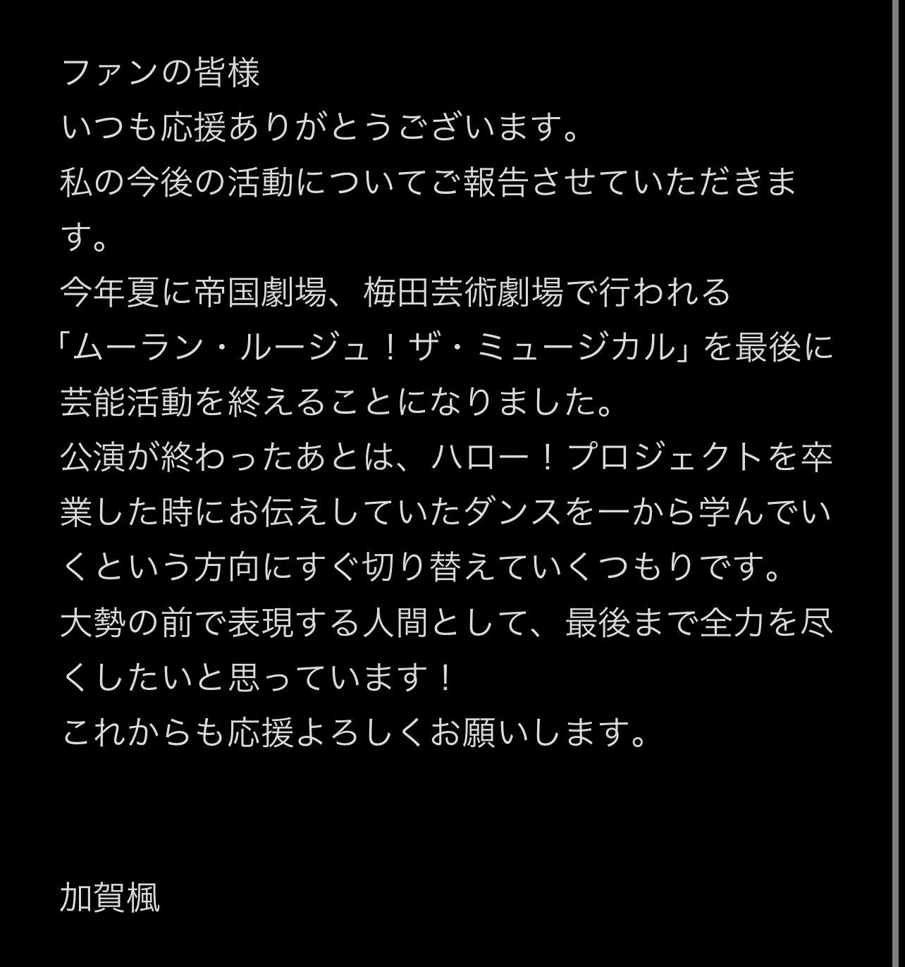 元モーニング娘。加賀楓、芸能活動終了を発表「ダンスを一から学んでいくという方向に」【全文】