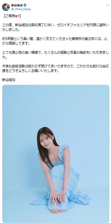 新谷姫加、5年所属のゼロイチファミリア退所を報告「芸能活動は変わらず続けてまいります」