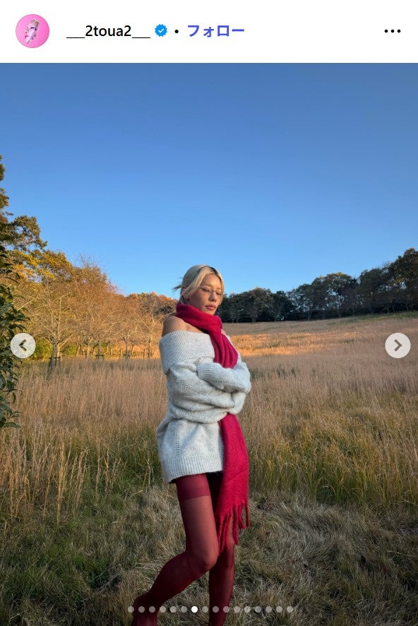 とうあ、美スタイル際立つオフショルミニワンピ×赤タイツの秋コーデ公開「センス抜群」「スタイルが神」の声