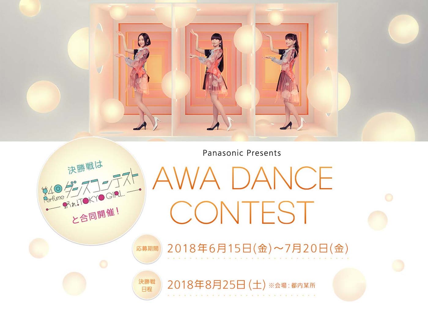 3年ぶり4回目となる「Perfume ダンスコンテスト~踊れ!TOKYO GIRL~」と合同開催される「AWA DANCE CONTEST」では「子供・親子部門」「夫婦・カップル部門」「友達・職場同僚部門」の3部門を実施。各部門1グループが「Perfume ダンスコンテスト~踊れ!TOKYO GIRL~」の決勝と同会場(都内某所)でダンスを披露する権利が与えられるというものです。
