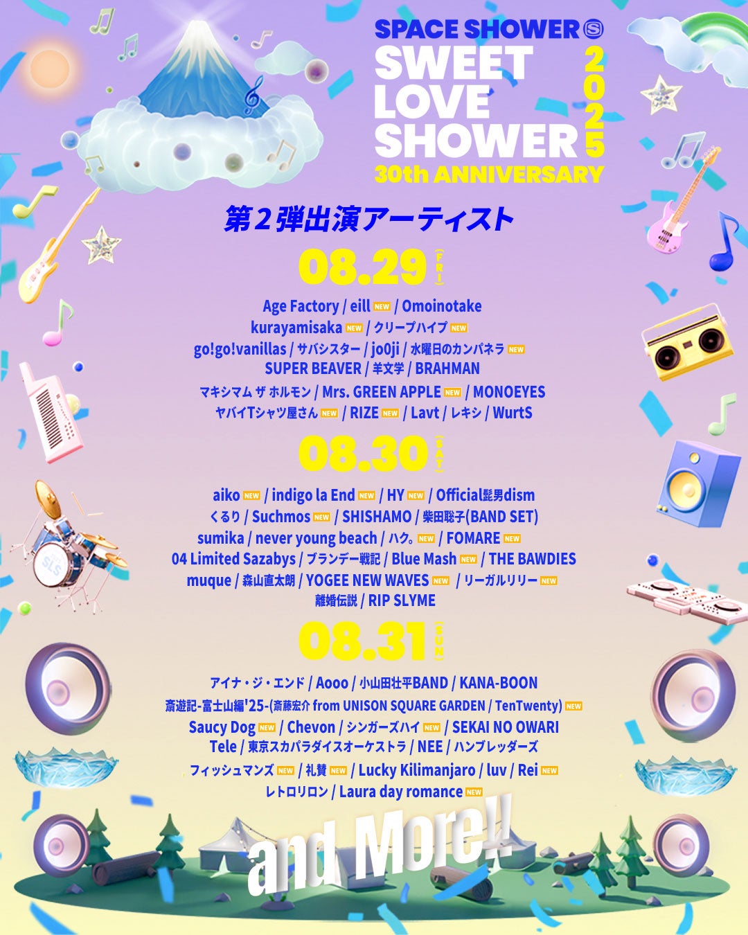 8月29日~31日に山梨県・山中湖交流プラザ きららにて開催される「SPACE SHOWER SWEET LOVE SHOWER 2025 30th ANNIVERSARY」より、第2弾出演アーティストと日割りが発表された。
