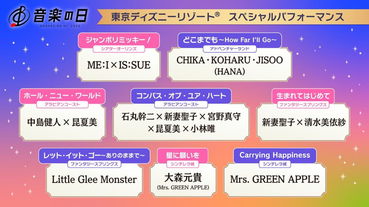 TBSでは、7月19日午後2時から8時間にわたって夏の大型音楽特番『音楽の日2025』を生放送。この度、東京ディズニーリゾートからのパフォーマンス企画の歌唱曲とアーティスト、歌唱ロケーションの総まとめ画像が公開された。