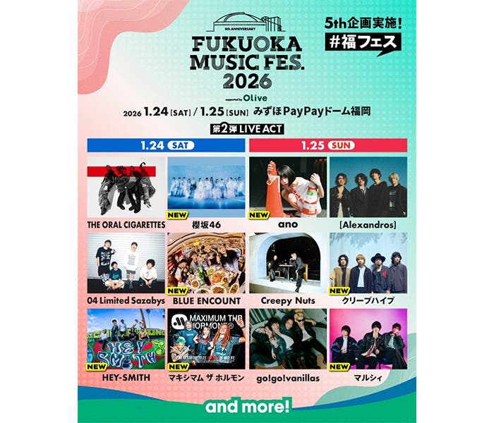 櫻坂46、ano、マキシマム ザ ホルモンら第二弾出演者発表!FUKUOKA MUSIC FES.2026(福フェス)