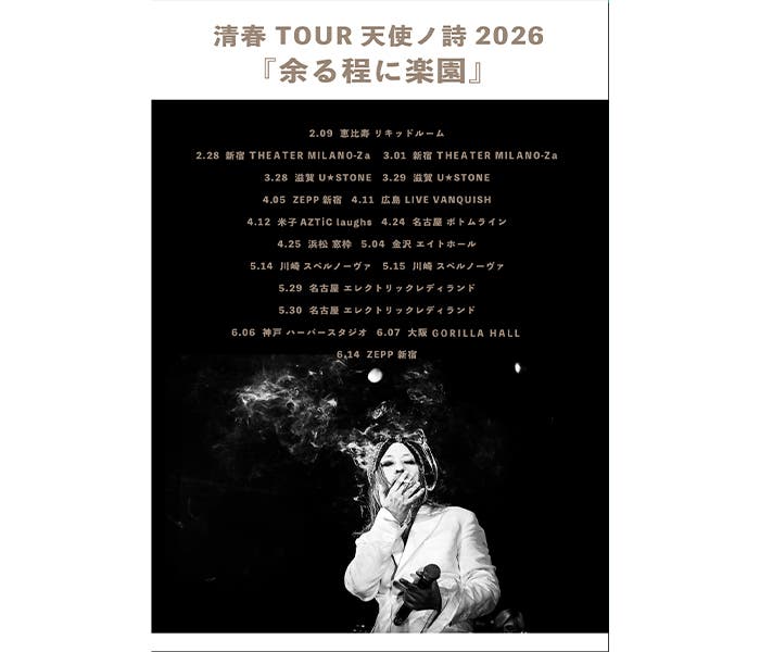 デビュー30周年記念での黒夢再始動と並行して、昨年から今年にかけては約100公演というツアーを行う清春が2026年の新たなツアー『余る程に楽園』を発表した。清春は近年では自身の活動において暫く訪れていなかった各地方への再訪を実現させている。これはこの数年の活…