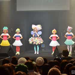雑誌「Zipper」「KERA」のモデルとして活躍するきゃりーぱみゅぱみゅは、胸元につけまつげモチーフをあしらった“パイ毛”トップスにお菓子袋のチュチュを合わせたポップなスタイリングで観客を釘付けに。会場にはハワイからやって来たきゃりーファンもおり、「かわいい~!」と惜しげもない歓声を浴びていた。