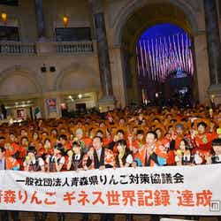 昨年11月、女優の上戸彩、タレントの優木まおみらに続く第5代「青森りんごクイーン」の称号を得たHKT48。同グループを代表し、指原莉乃、多田愛佳、兒玉遥、宮脇咲良、田島芽瑠、朝長美桜の6人はこの日、都内で行われたイベントに出席。りんごコスチュームをまとった307人のファンと共に「Largest gathering of people dressed as fruits」(一つの場所でフルーツの仮装をした人の最も多く集まるというもの)のギネス世界記録に挑み、2013年6月2日にイギリスで達成された292人の記録を見事に破った。結果は4人失格で303人。