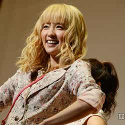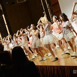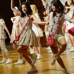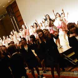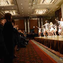そのまま、「Diamond Only」をパフォーマンス。新入社員たちは次々と席から立ち上がり、飛び跳ねるなどして、迫力のパフォーマンスを楽しんだ。すると、突如前に飛び出し、E-girlsとともにダンスをするリクルートスーツ姿の新入社員たちが。彼女たちの正体は、新入社員に成りすましたEXILEダンススクール「EXPG」の生徒たち50人。E-girlsとEXPGらの圧巻パフォーマンスで、会場を熱狂の渦に包み込んだ。