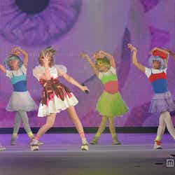 きゃりーは登場とともに「ファッションモンスター」を披露し、一気にきゃりーワールド突入へ。2曲目に入る前には「この曲は家族愛をテーマにしていて、ロボット調の曲です。歌詞が感動的で、お父さんを想う詞になっています」と紹介。独特のサウンドにのり、クレヨンしんちゃんとともに最新曲「ファミリーパーティー」を披露。2人は時折、顔を見合わせながら話題の“ロボットダンス”を軽快にこなした。クレヨンしんちゃんと共演に、笑顔のきゃりー