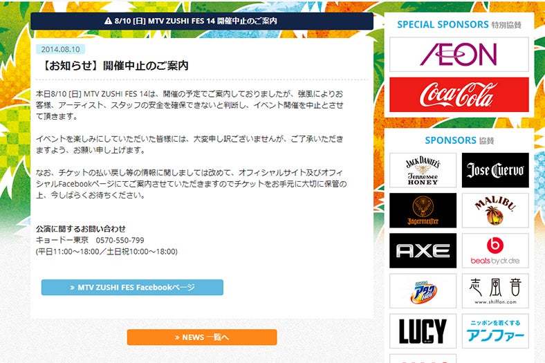 神奈川・リビエラ逗子マリーナにて開催中の「MTV ZUSHI FES 14」(8日~10日)の中止が発表された。