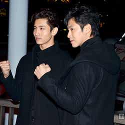 韓国アーティストの東方神起が15日、グループカラーの赤でライトアップされた水上バス「HOTALUNA(ホタルナ)」に乗船し、東京・お台場海浜公園にサプライズ登場した。