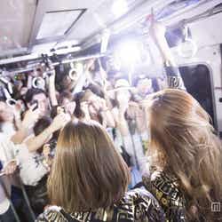 チケットを手にした乗客が特別改札を通るとCYBERJAPAN DANCERSのメンバーがハイタッチでお出迎え。そのまま階段を登り、ホームにて特別臨時列車「geHa TRAIN」の到着を待ちわびた。ホームに電車が到着すると、乗客は一斉に乗車。事前の注意事項が車内アナウンスで流れるという「ageHa TRAIN」ならではの粋な演出もあり、開始前から車内は熱気に包まれた。