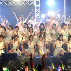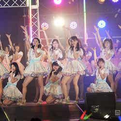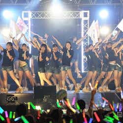 13日、愛知県・小野浦海水浴場で開催された美浜海遊祭にてライブを開催したSKE48。ライブ開始とともに雨が降りだしたものの、計3400人のファンが集まった。