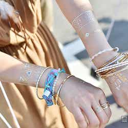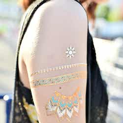 世界各国の「ULTRA」でも大人気だった“シャイニングタトゥー”。海外セレブが人気の火付けとなったシャイニングタトゥーは、金箔や銀箔を身にまとったようなタトゥーシールで、誰でも簡単につけることができる優れもの。キラキラと輝く肌を演出することができます。今年の「ULTRA JAPAN」でも腕や脚、目元などの顔や胸元をシャイニーにデコレーションし、コーディネートに輝きを添える女子が圧倒的に多くみられました。今年の人気No.1アイテムと言っても過言ではない“シャイニングタトゥー”。ゴールドやシルバー、メタリックブラックなどのカラーが人気のようです。
