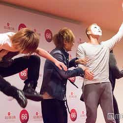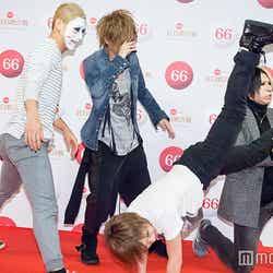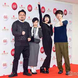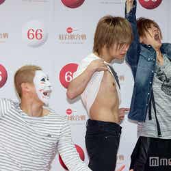 ゴールデンボンバーはレッドカーペットに姿を現すと報道陣の前までジャンプ&全速力で登場。様々な決めポーズを披露しながら大量のフラッシュを浴びた。今回、4年連続4度目の出場で、歌うのは4年連続「女々しくて」。毎年奇抜なパフォーマンスに注目が集まっており、昨年は樽美酒研二が舞台上で“公開丸刈り”をして話題を呼んだ。