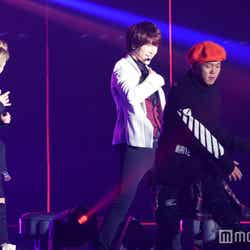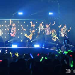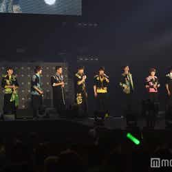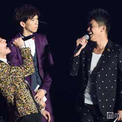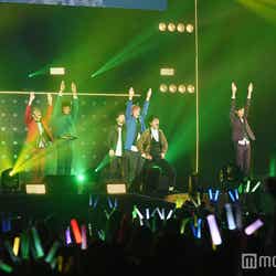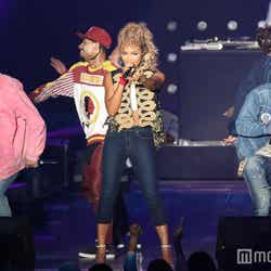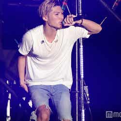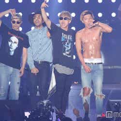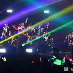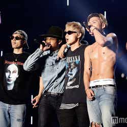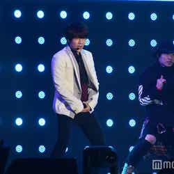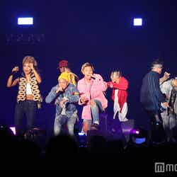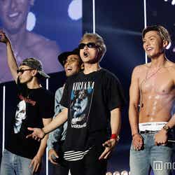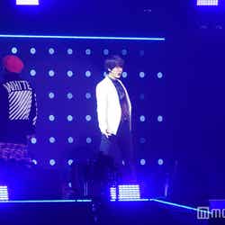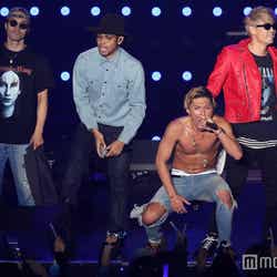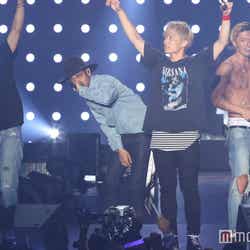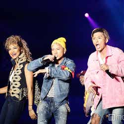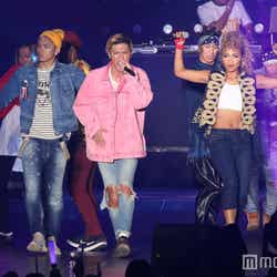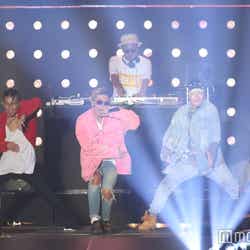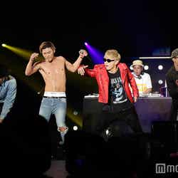 EXILE系ガールズユニット・E-girlsは個性豊かな衣装に身をつつみ登場。ラスト40秒の一糸乱れぬダンスが印象的な「DANCE WITH ME NOW!」で、冒頭から観客のテンションを引き上げると、立て続けに「Anniversary!」をパフォーマンス。腕をぐるぐると回す“縄跳びダンス”で観客をあおりながら、キュートな笑顔を振りまいた。EXILE SHOKICHI、新曲初披露