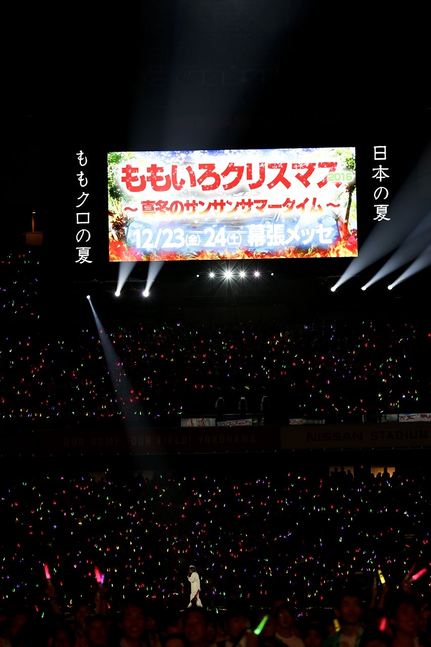後半では、昨日に続きNEWシングル「ザ・ゴールデン・ヒストリー」(9月7日リリース)をパフォーマンス。その後、突如として松崎しげるがサプライズ登場。「愛のメモリー」の歌詞に乗せて今年12月23日(金)、24日(土)に千葉・幕張メッセにてクリスマスライブ「ももいろクリスマス2016 〜真冬のサンサンサマータイム〜」を開催することをサプライズ発表した。